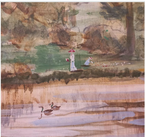 PROJET MATSOÉlaboration d’un décor peint sur des lambris 19ème dans l’esprit du parc à l’Anglaise et des papiers peints Zuber + rechampi des moulures 19ème en couleurs.